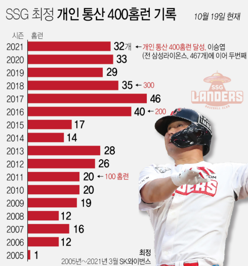 - 2022년: 통산 400홈런 돌파 및 현역 최다 홈런 타이틀 획득