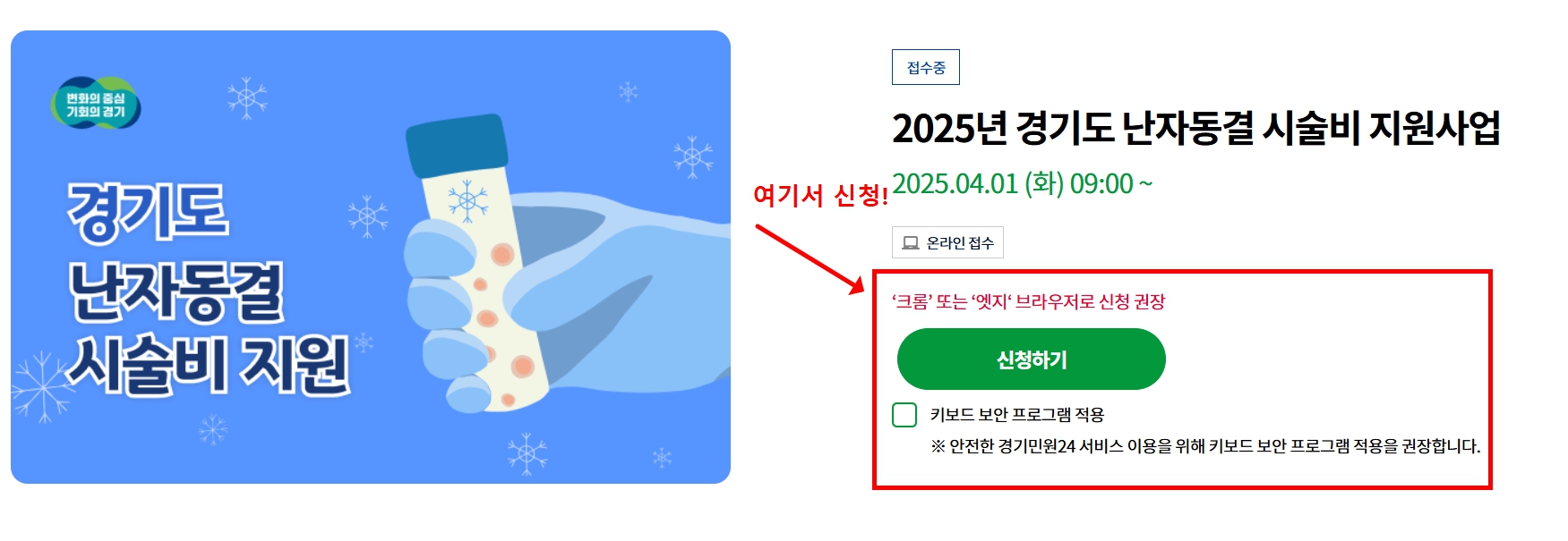 2025년 4월 1일부터 온라인 접수를 시작하며, 선정 시 난자채취를 위한 사전 검사비와 시술비 본인부담금의 50%를 생애 1회, 최대 200만원까지 지원합니다.