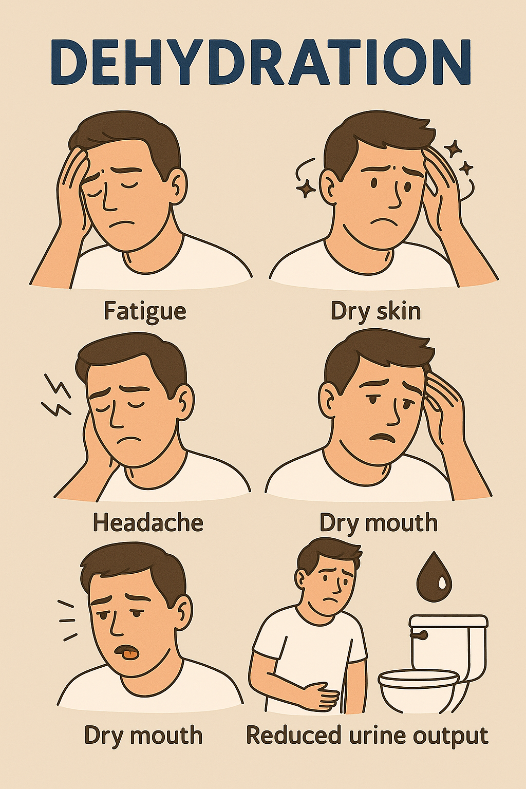 원기 없음, 피부 건조, 소변 감소, 입안 건조, 두통, 현기증 등 탈수 증상을 빠르게 인지하세요. - 즉시 수분 보충